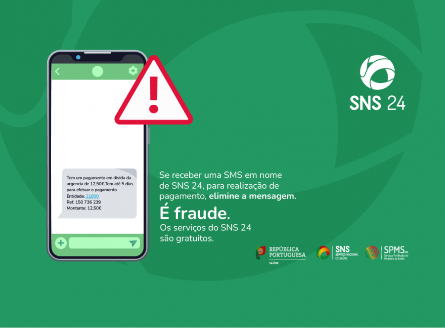 Alertamos que estão em circulação SMS falsas em nome do SNS 24. Essas mensagens indicam que tem valores em dívida e incluem uma referência de multibanco para realizar o pagamento no prazo de 5 dias.