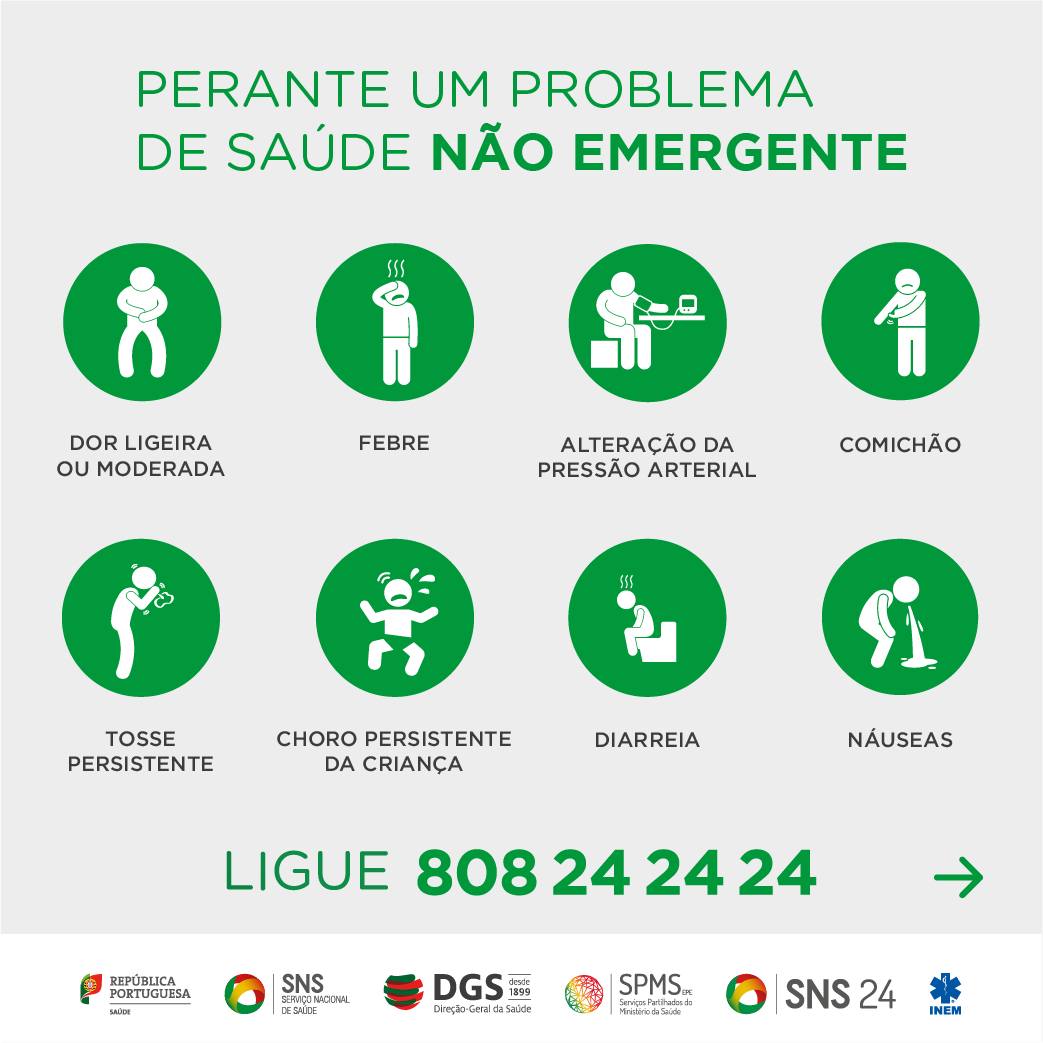 Em caso de dor ligeira ou moderada, febre, alteração da pressão arterial, comichão, tosse persistente, choro persistente da criança, diarreia ou náuseas, ou outra situação não emergente, o utente deve entrar em contacto com o SNS 24 através do número 808 24 24 24 para receber o aconselhamento adequado. Já quando se trate de um acidente com feridos, uma suspeita de AVC, dor no peito, engasgamento, dificuldade em respirar, alteração do estado de consciência, queimaduras graves ou em zonas sensíveis, hemorragias abundantes ou incontroláveis, o utente deve ligar 112 - Número Europeu de Emergência.