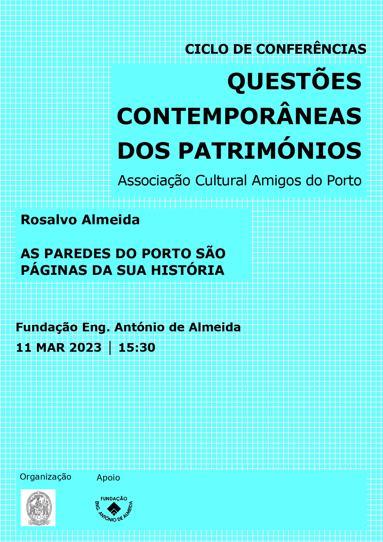A conferência, subordinada ao tema “As paredes do Porto são páginas da sua História”, será proferida pelo Dr. Rosalvo Almeida, antigo neurologista do Hospital de Santo António e terá lugar na Fundação Eng. António de Almeida (Porto), no próximo dia 11 de março (sábado), pelas 15h30.