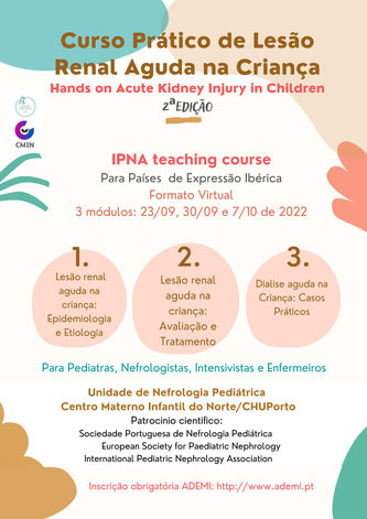 O Curso Prático de Lesão Renal Aguda na Criança (Hands on Acute Kidney Injury in Children) é desenvolvido pela Unidade de Nefrologia Pediátrica do Centro Materno Infantil do Norte (CMIN) em parceria com a International Pediatric Nephrology Association (IPNA teaching course), e dirige-se predominantemente a Países de Expressão Ibérica. O curso terá a duração de 3 dias e é lecionado por um grupo alargado de profissionais entre os quais se incluem pediatras, nefrologistas, intensivistas e enfermeiros, com ampla experiência.