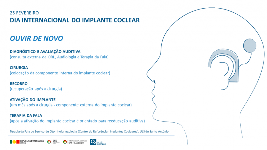 O dia 25 de Fevereiro é o Dia internacional do Implante Coclear e a ULS de Santo António - Setor de Terapia da Fala do Serviço de ORL realizou um vídeo com depoimentos de utentes que utilizam Implante Coclear, uni ou bilateralmente. Sendo este um centro de referência para a cirurgia de Implante Coclear, pretende-se dar a conhecer, na primeira pessoa, a experiência de usar o implante, desmistificar alguns pré-conceitos e elucidar o público e os profissionais de saúde sobre esta temática.
