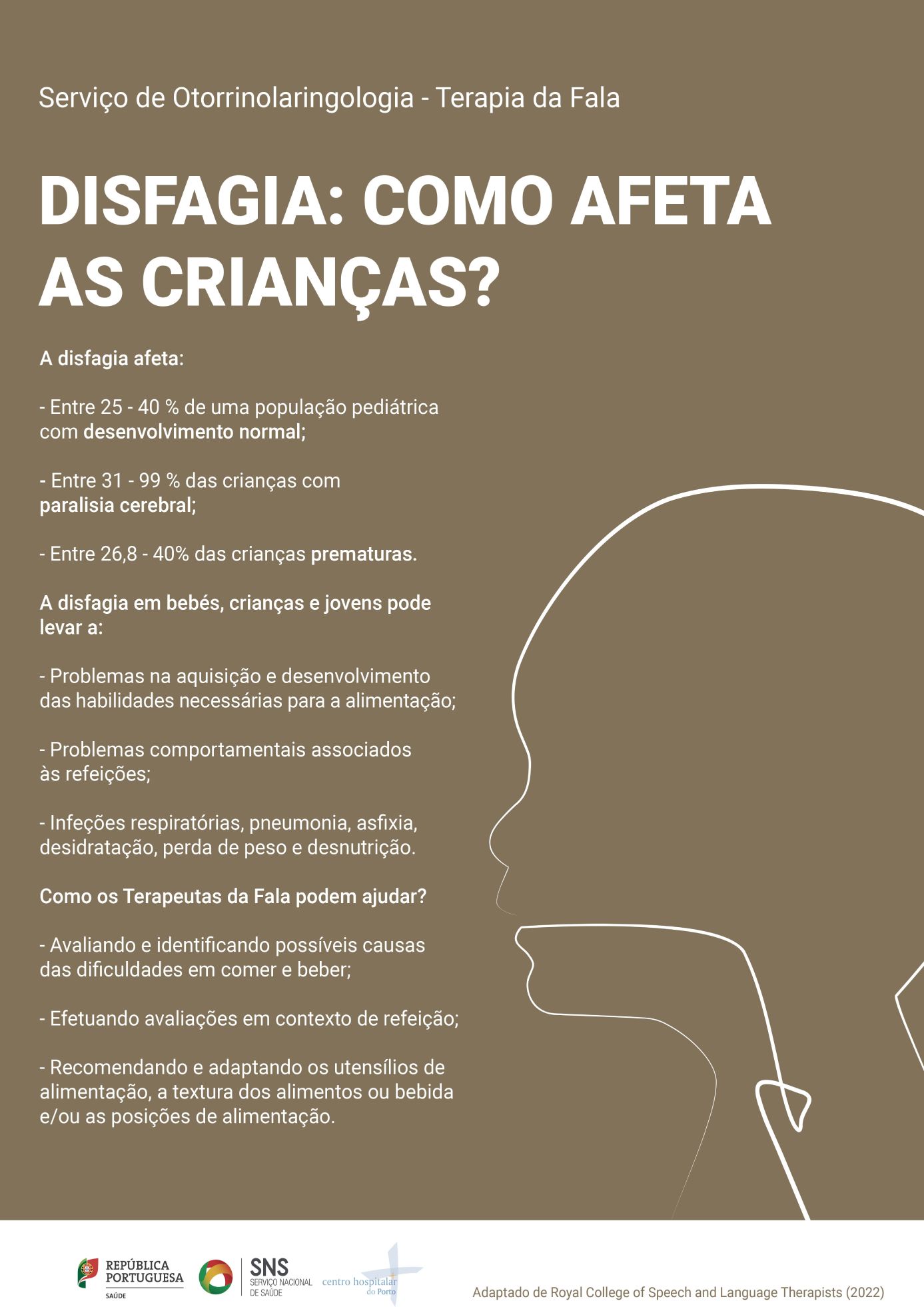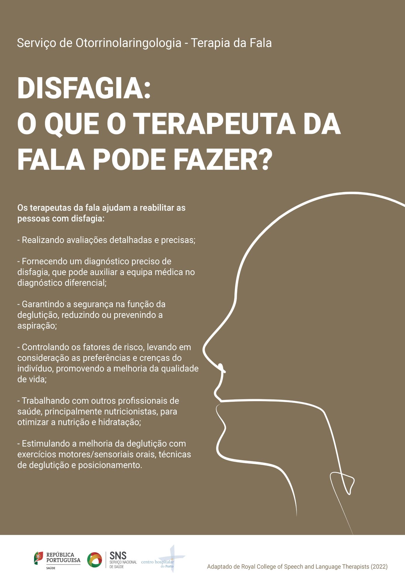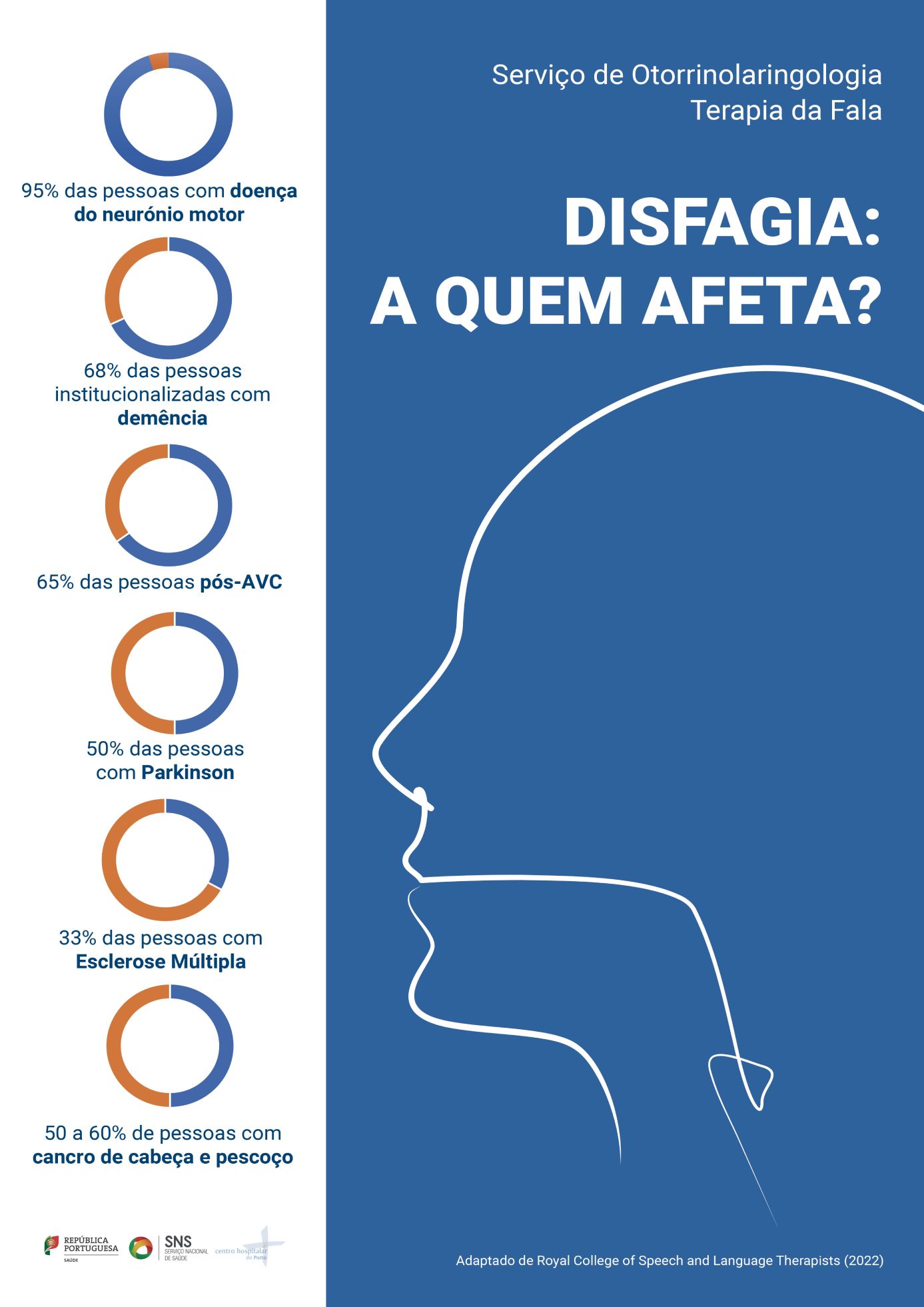 A Terapia da Fala acompanha estes casos no Centro Hospitalar Universitário do Porto (CHUPorto) desde 2000, com uma diferenciação académica na área em 2010 e a criação da ''Consulta de Disfagia'' multidisciplinar, no serviço de Otorrinolaringologia - Departamento de Neurociências, desde 2016.