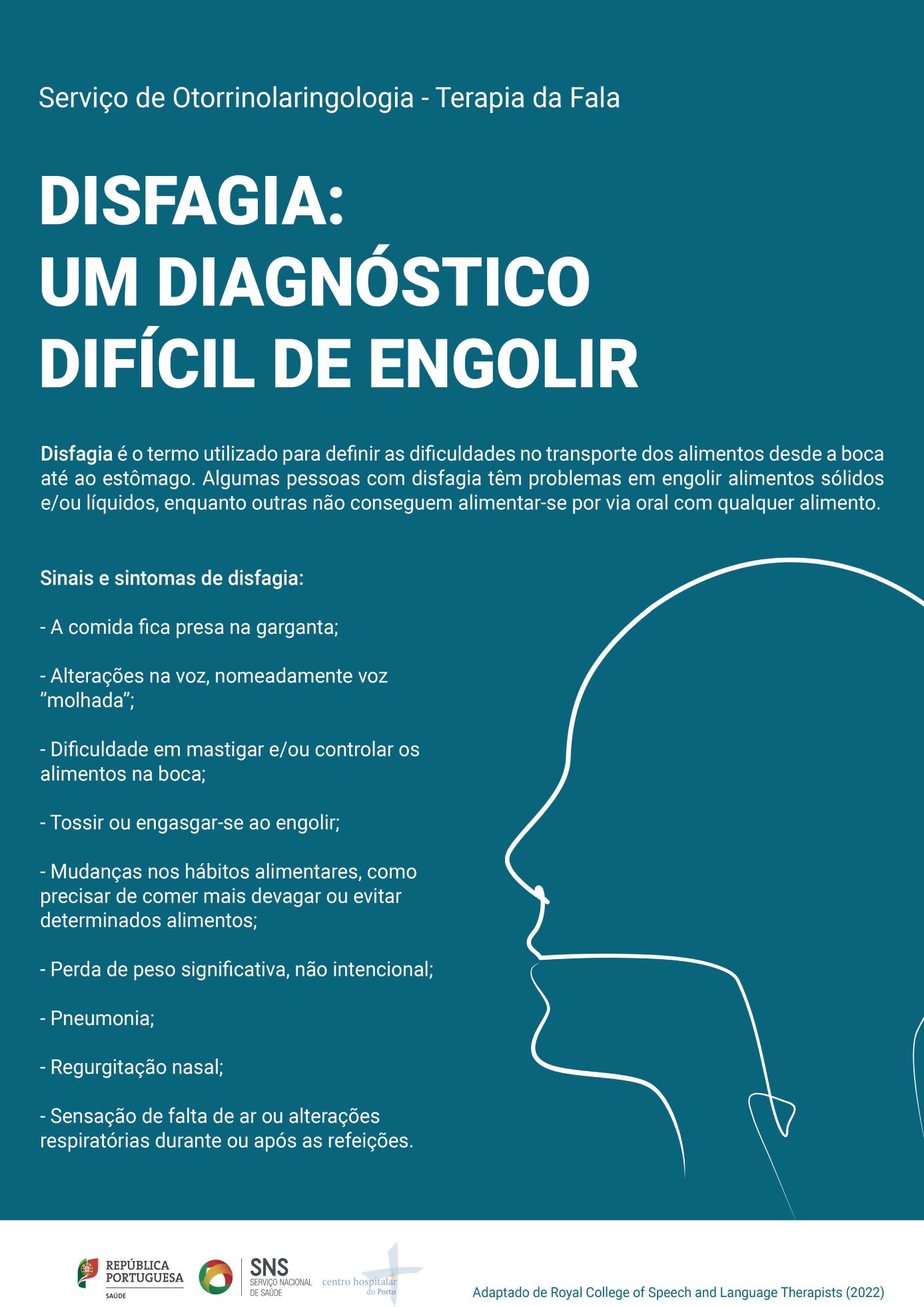 Através de pósteres informativos distribuídos pelo CHUPorto e a apresentação de conteúdos sobre deglutição e disfagia nos screen savers da Instituição, pretende-se aumentar a consciencialização para a importância e a prevalência das alterações da deglutição (disfagia) junto dos profissionais de saúde, doentes e cuidadores.