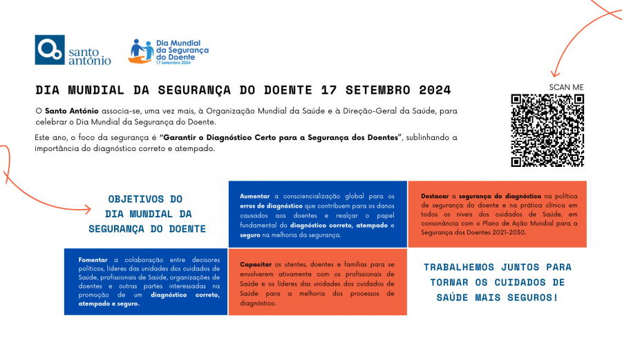 A ULS de Santo António, associa-se à Organização Mundial da Saúde (OMS) e à Direção-Geral da Saúde (DGS), para novamente celebrar o Dia Mundial da Segurança do Doente. Este ano, o tema central foca-se em “Garantir o Diagnóstico Certo para a Segurança dos Doentes”, destacando a relevância de um diagnóstico correto e atempado como elemento essencial na proteção e segurança dos doentes.