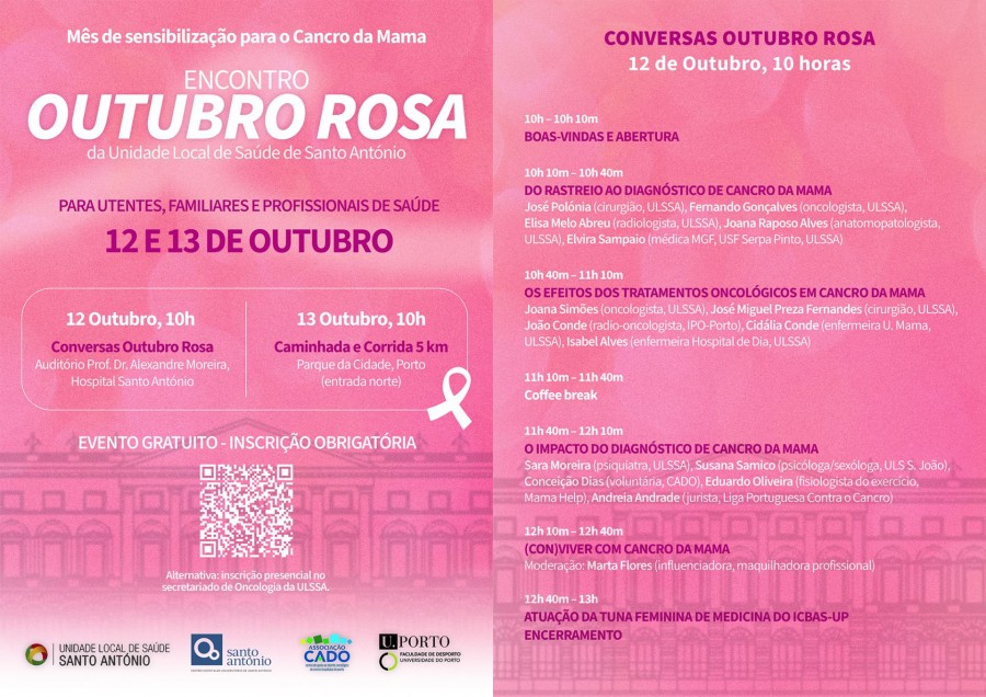 O programa arranca no dia 12 de outubro, às 10h, no Auditório Prof. Dr. Alexandre Moreira, no Hospital Santo António. com as "Conversas Outubro Rosa". Este será um espaço de partilha e discussão entre especialistas de várias áreas. A primeira sessão será dedicada ao rastreamento e diagnóstico do cancro da mama.