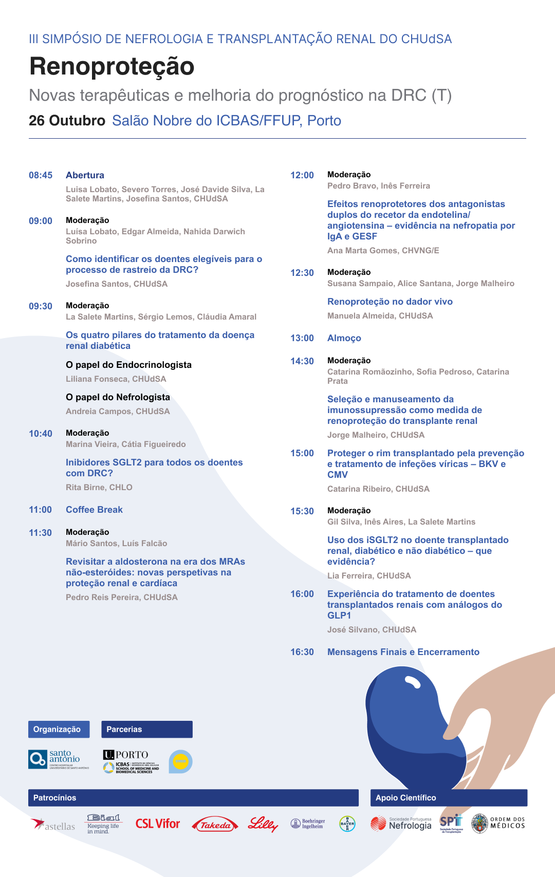 Este simpósio é uma oportunidade única para os profissionais de saúde aprofundarem os seus conhecimentos sobre as mais recentes terapêuticas e estratégias de renoproteção, contribuindo assim para a melhoria do prognóstico dos doentes com doença renal crónica.