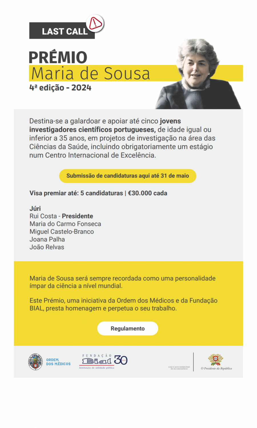 As candidaturas encerram a 31 de maio de 2024. Pode consultar o regulamento e submissão da candidatura: https://bialfoundation.com/pt/premios/premio-maria-de-sousa/