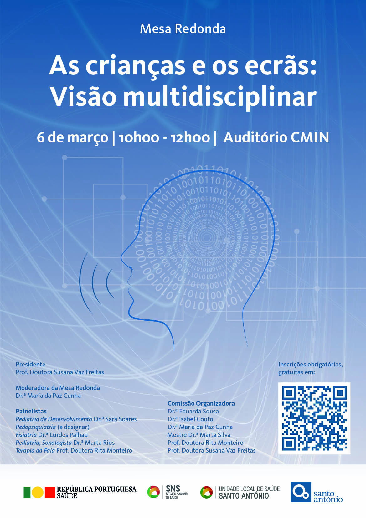 No âmbito das celebrações do DIA EUROPEU DA TERAPIA DA FALA, que se assinala a 6 de março, o grupo de Terapeutas da Fala da ULS de Santo António organiza uma mesa redonda subordinada ao tema: “As crianças e os ecrãs: Visão multidisciplinar”.