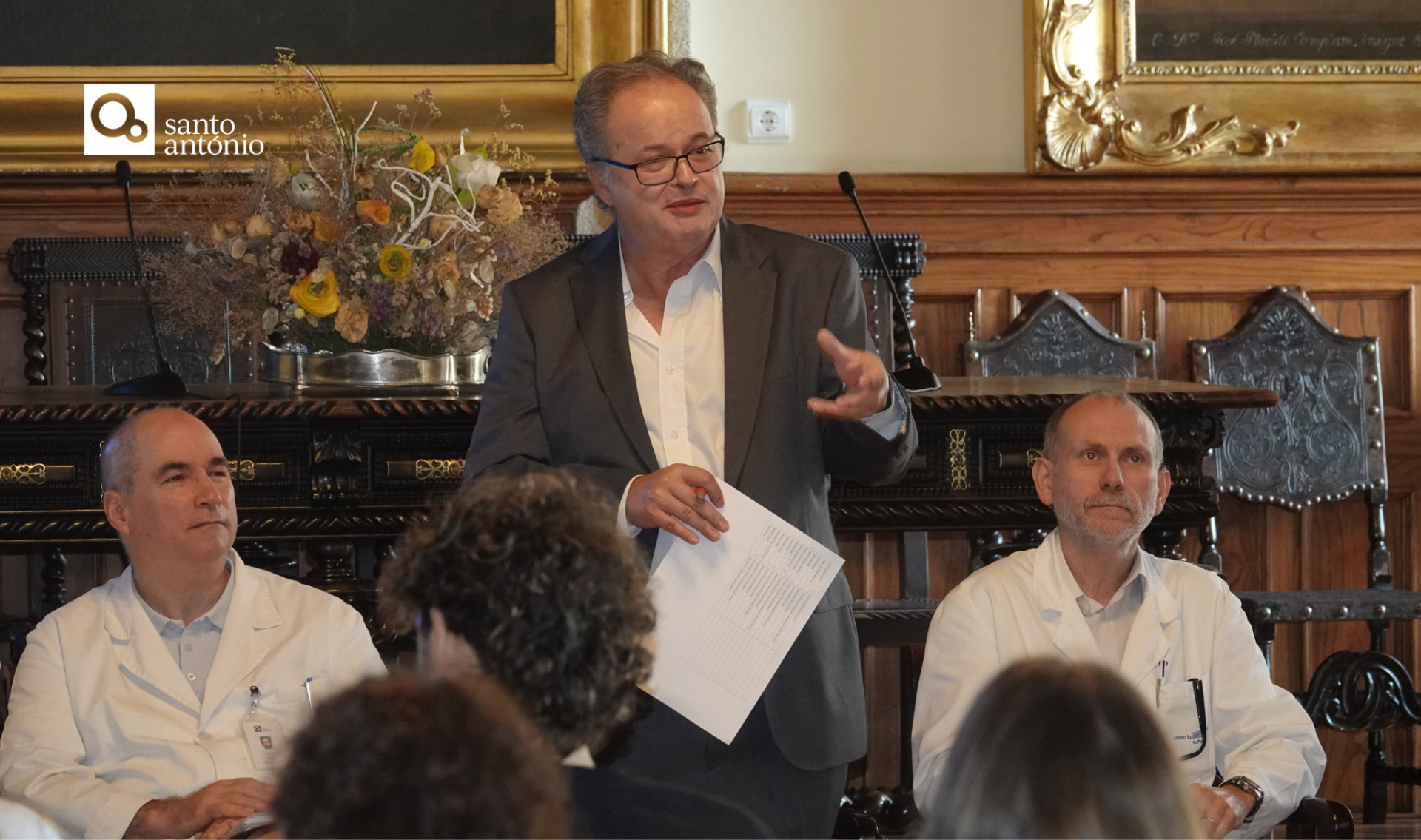 O Prof. Doutor José Barros, diretor clínico do Centro Hospitalar Universitário de Santo António, recebeu os 39 novos médicos de 20 especialidades hospitalares (*), acompanhado pelos adjuntos Dr. António Marques, Prof. Doutor Castro Poças, Dr.ª Isabel Santos e Dr. Paulo Paiva.