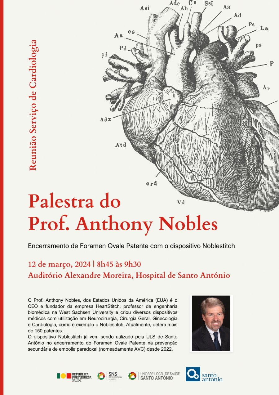 No próximo dia 12 de março, entre as 8h45 e as 9h30, no Auditório Alexandre Moreira (HSA), decorre a palestra do Prof. Anthony Nobles (EUA)* sobre o encerramento de Foramen Ovale Patente com o dispositivo Noblestitch.