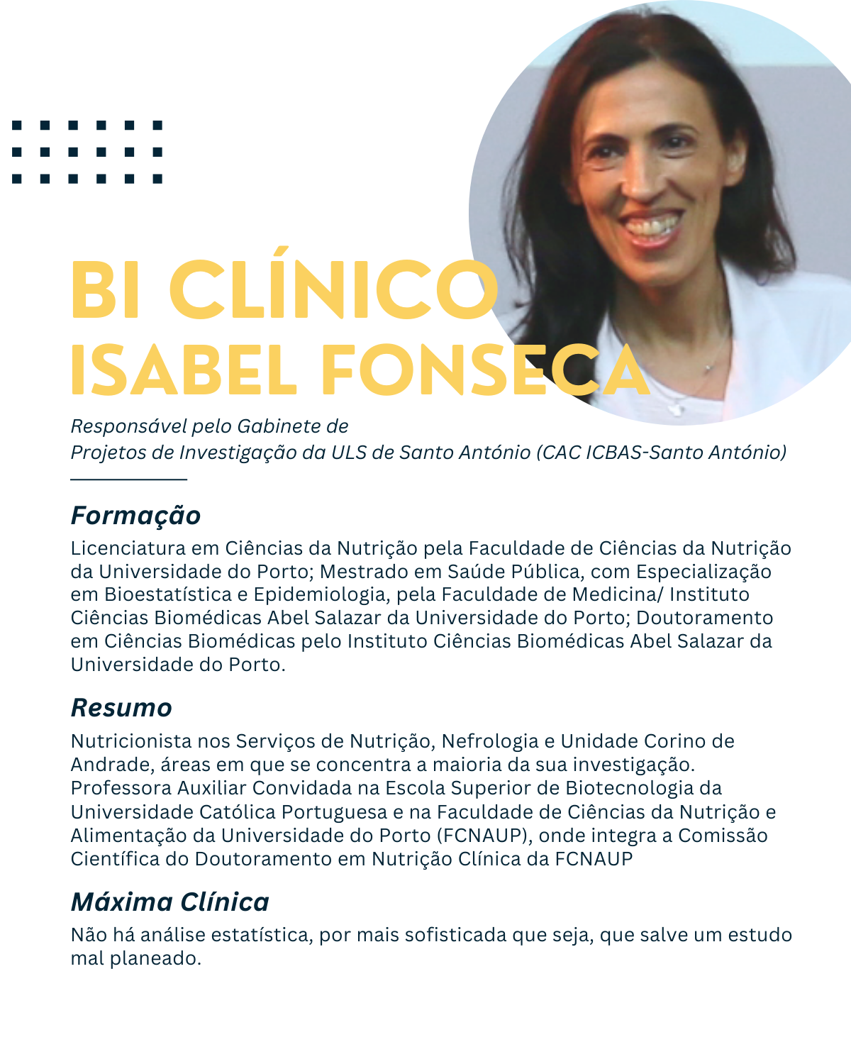 Mestrado em Saúde Pública, com Especialização em Bioestatística e Epidemiologia, pela Faculdade de Medicina/ Instituto Ciências Biomédicas Abel Salazar da Universidade do Porto;