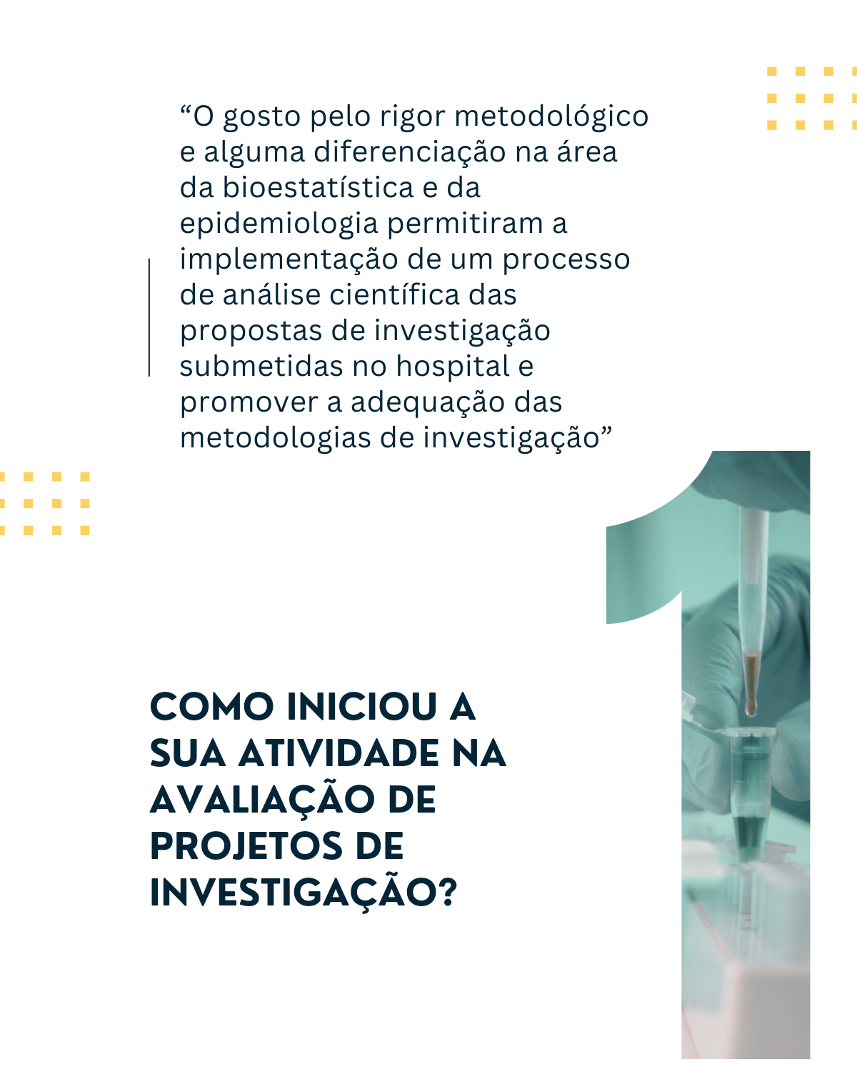 Em 2007, inserido no Departamento de Ensino, Formação e Investigação (DEFI) do Hospital de Santo António, foi criado o Gabinete Coordenador da Investigação por iniciativa e sob a responsabilidade da Prof. ª Doutora Margarida Lima. O apoio à preparação e submissão de projetos de investigação e a partilha de boas práticas de investigação fundamentaram a criação de um gabinete de características particulares e com algum impacto na instituição. Integrei a equipa multidisciplinar do Gabinete Coordenador da Investigação, nesse mesmo ano de 2007. O gosto pelo rigor metodológico e alguma diferenciação na área da bioestatística e da epidemiologia permitiram a implementação de um processo de análise científica das propostas de investigação submetidas no hospital e promover a adequação das metodologias de investigação, salvaguardando a segurança dos participantes e o cumprimento das normas institucionais. Foi um processo que partiu do zero, construído passo a passo e que ainda hoje reflete o trabalho de uma equipa pequena e coesa, que integro e lidero.