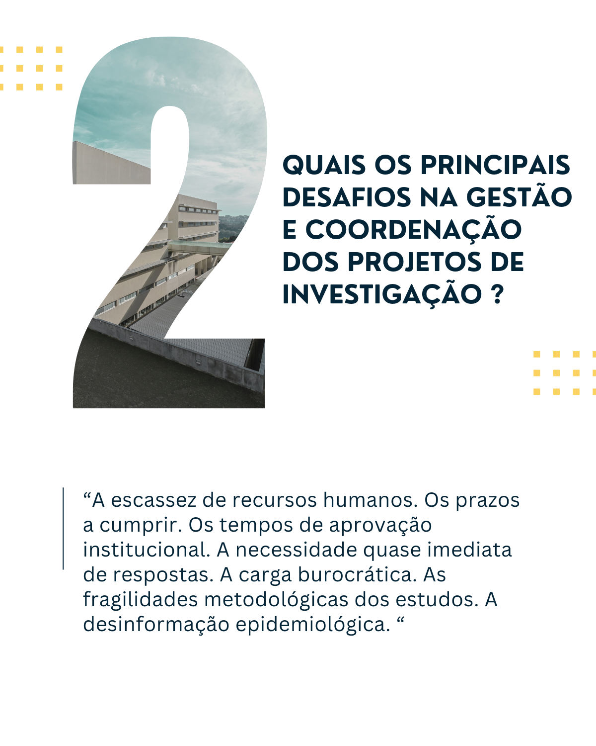 - Quais são os principais desafios que enfrenta na gestão e coordenação dos projetos de investigação na ULS de Santo António?