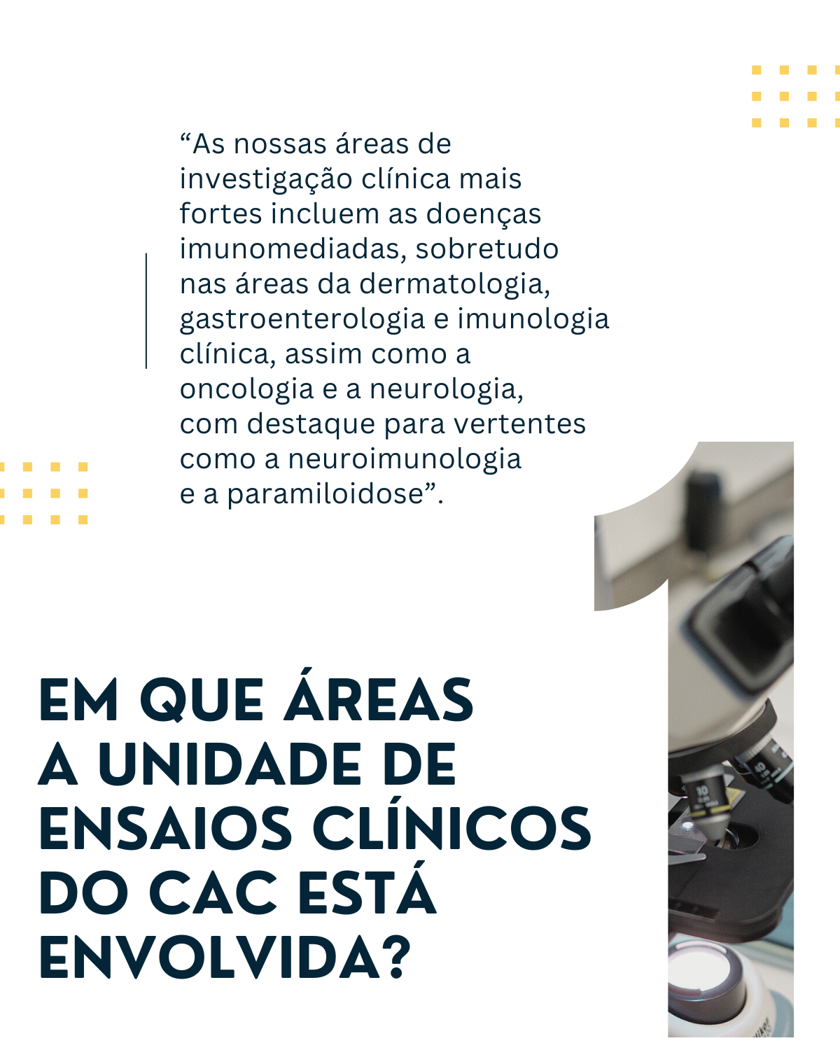 A Unidade de Ensaios Clínicos do CAC é um centro altamente procurado pelos promotores de ensaios clínicos. Contamos com inúmeros investigadores, reconhecidos como especialistas em diversas áreas da medicina, e temos um histórico de muitos anos de excelência na condução de ensaios clínicos, especialmente de fase 2 e fase 3, assim como estudos observacionais. Além disso, estamos a tornar-nos cada vez mais ágeis e competitivos. As nossas áreas de investigação clínica mais fortes incluem as doenças imunomediadas, sobretudo nas áreas da dermatologia, gastroenterologia e imunologia clínica, assim como a oncologia e a neurologia, com destaque para vertentes como a neuroimunologia e a paramiloidose. Outras áreas também estão em claro crescimento, como a cardiologia, nefrologia e oftalmologia, entre outras. Diria, portanto, que estes são os grandes pilares da Unidade de Ensaios Clínicos do CAC.