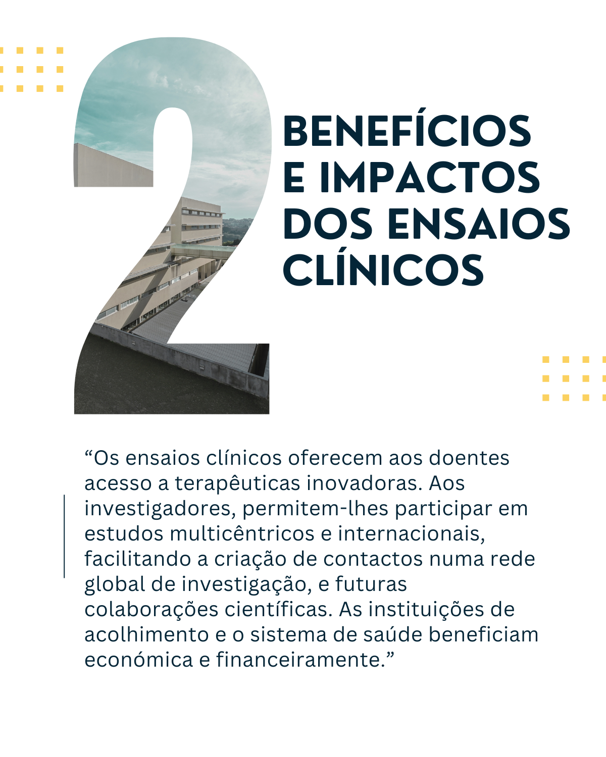 Os ensaios clínicos são extremamente importantes e trazem inúmeros benefícios em várias áreas: aos doentes, aos investigadores e às instituições de saúde. Os ensaios clínicos oferecem aos doentes acesso a terapêuticas inovadoras, muitas vezes quando ainda não existem outras opções disponíveis para a sua patologia ou quando já esgotaram todas as terapêuticas disponíveis. Isso pode proporcionar uma nova esperança de tratamento para condições que anteriormente não tinham soluções eficazes. Aos investigadores, a participação em ensaios clínicos permite-lhes associar a sua prática assistencial à investigação clínica, participando em estudos multicêntricos e internacionais, facilitando a criação de contactos numa rede global de investigação, e futuras colaborações científicas. Por fim, também as instituições de acolhimento e o sistema de saúde beneficiam económica e financeiramente. O investimento feito pelos promotores nos ensaios reduz os custos do tratamento dos doentes, além de gerar receitas para as instituições de acolhimento. Dessa forma, os ensaios clínicos ajudam a aliviar a pressão financeira sobre o sistema de saúde, enquanto oferecem tratamentos inovadores e eficazes.
