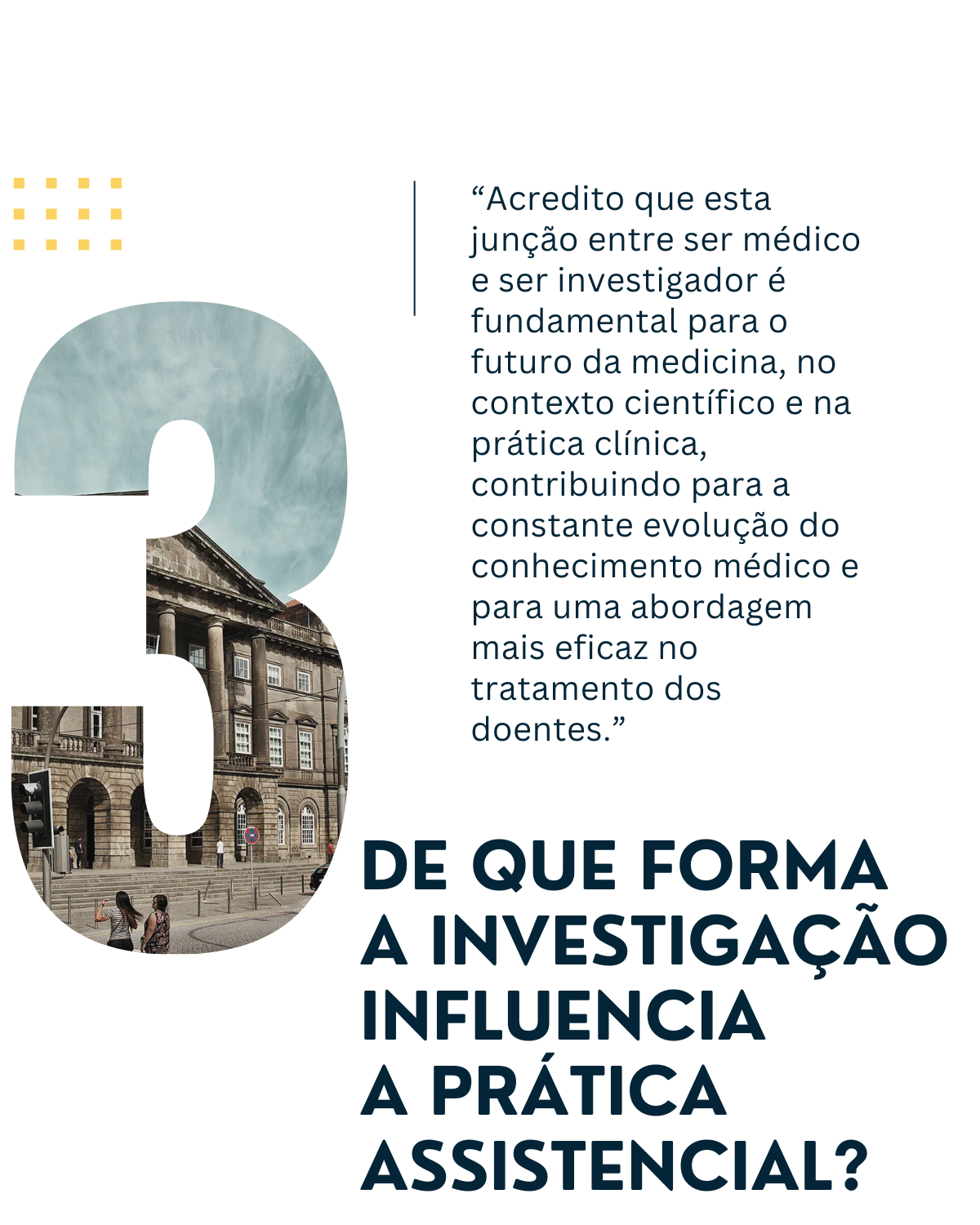 Os médicos procuram frequentemente aliar a sua atividade assistencial do dia a dia à investigação, e temos observado que as novas gerações de médicos demonstram um grande interesse na investigação clínica, especialmente em ensaios clínicos. Esta combinação oferece uma visão mais abrangente sobre o tratamento dos doentes, permitindo aos médicos envolverem-se em projetos inovadores e aceder a terapêuticas de vanguarda. Acredito que esta junção entre ser médico e ser investigador é fundamental para o futuro da medicina, no contexto científico e na prática clínica, contribuindo para a constante evolução do conhecimento médico e para uma abordagem mais eficaz no tratamento dos doentes.