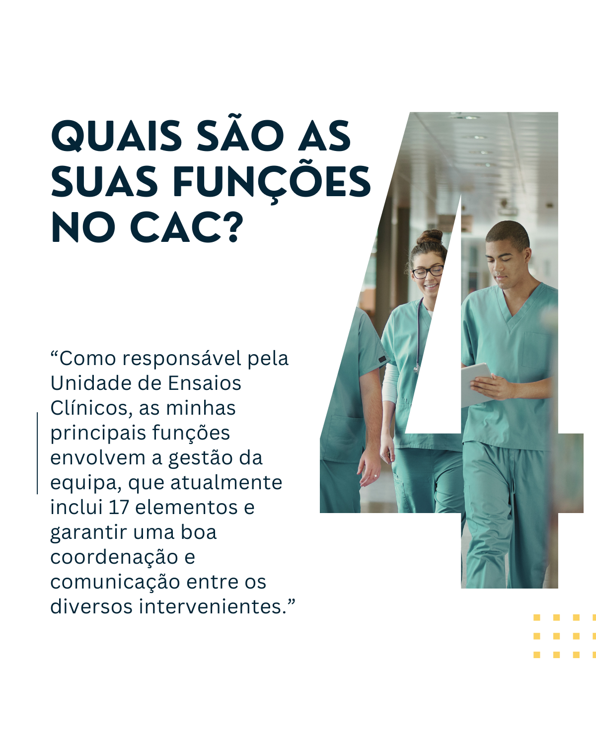 Como responsável pela Unidade de Ensaios Clínicos, as minhas principais funções envolvem a gestão da equipa, que atualmente inclui 17 elementos e garantir uma boa coordenação e comunicação entre os diversos intervenientes nos ensaios clínico, como os promotores, os investigadores, os serviços farmacêuticos, outros serviços de apoio, os coordenadores de estudos, entre outros. É fundamental sermos uma estrutura ágil e competitiva, assegurando que os ensaios são conduzidos de forma eficiente e em conformidade com as exigências regulatórias e científicas, sempre com o objetivo de oferecer o melhor tratamento possível aos doentes.