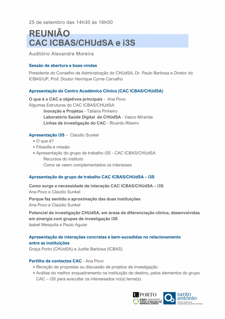 Convidamos a estar presente na reunião do CAC ICBAS/CHUdSA com o i3S, que se realiza no dia 25 de setembro, pelas 14h30 no Auditório Alexandre Moreira.