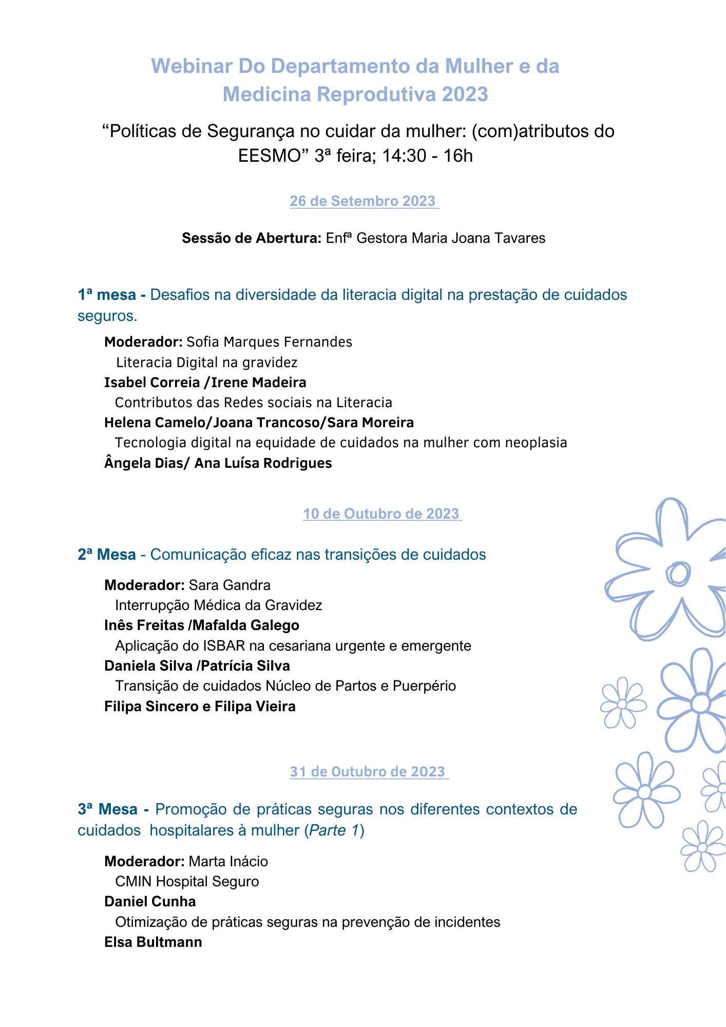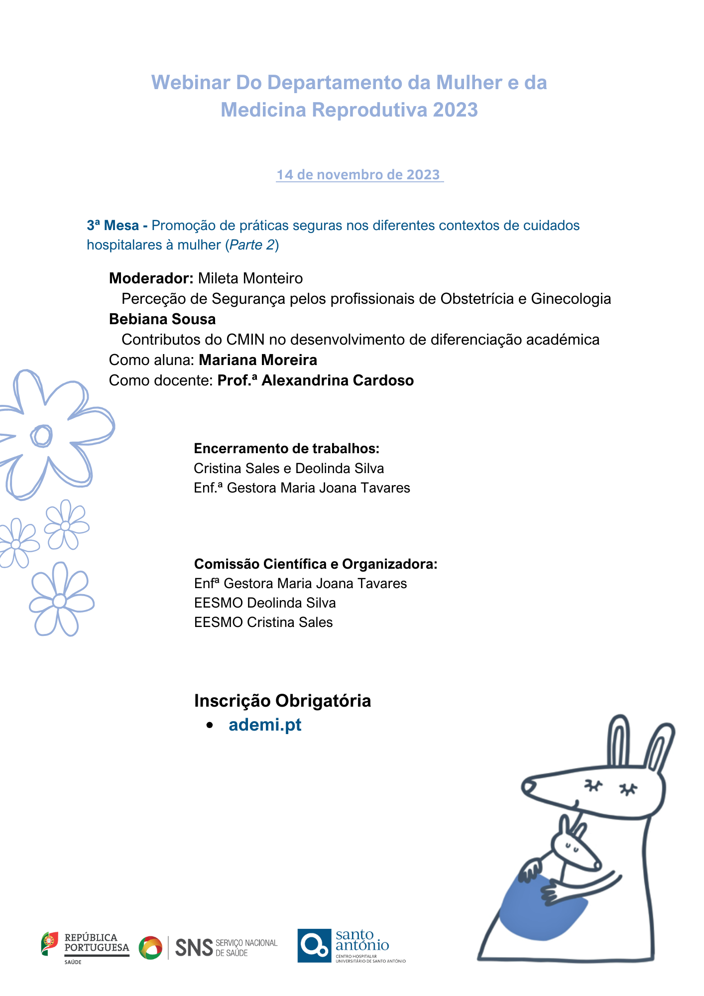 O Departamento da Mulher e da Medicina Reprodutiva do CMIN/Centro Hospitalar Universitário de Santo António, organiza de 26 de setembro a 14 de novembro de 2023, o Webinar “Políticas de Segurança no cuidar da mulher: (com)atributos do EESMO”.