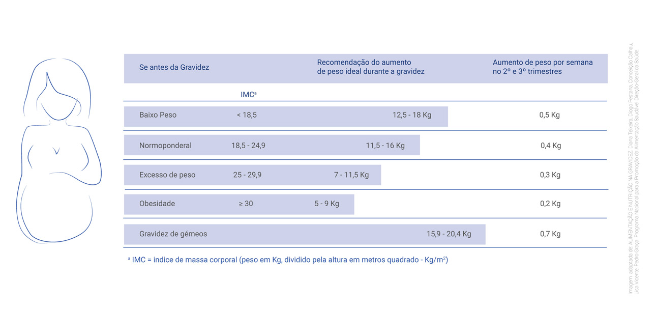 A imagem seguinte espelha as recomendações da Direção Geral de Saúde (DGS) para um aumento de peso equilibrado de acordo com o índice de massa corporal (IMC) da mulher antes de engravidar:
