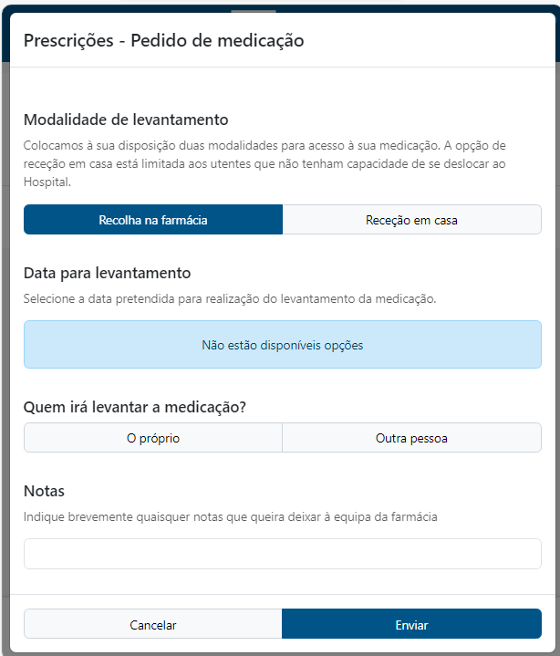 Caso opte pela opção “Recolha na Farmácia” terá a possibilidade de selecionar as datas e horas disponíveis para proceder o levantamento, bem como indicar outra pessoa para a recolha, se o desejar. Poderá também acrescentar, caso necessário, uma nota que será consultada pelo seu farmacêutico.